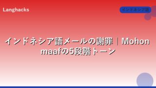 インドネシア語の謝罪メールをMaafからMohon maaf yang sebesar-besarnyaまで5段階トーンで解説。誤送信・納期遅延・クレーム対応の4段構造テンプレ、クッション言葉20選、BUMN宛ての強度判定基準を整理します。