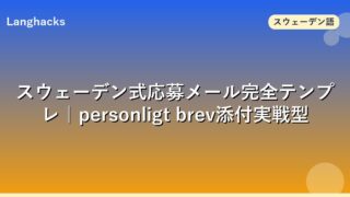 スウェーデン式応募メールを本文80-120字+Personligt brev+CV2ページの3点セットで完全テンプレ化。du-reform前提の件名Ansökan形式と添付ファイル命名規則、Med vänliga hälsningar結びを実戦解説します。