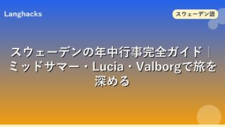 スウェーデンの年中行事を季節別に完全ガイド。ミッドサマー・Lucia・Valborg・Advent・冬のクリスマス市場など主要祭りの日程と楽しみ方、現地語彙、旅行プランニングのヒントまで、北欧旅を物語にする保存版ガイド。