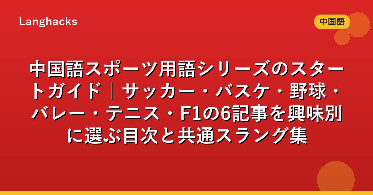 本ハブは中国語スポーツシリーズ6本の入口・選び方ガイドとして、競技横断で使える共通スラング・SNS略語・応援フレーズ・購入表現を一括収録しました。