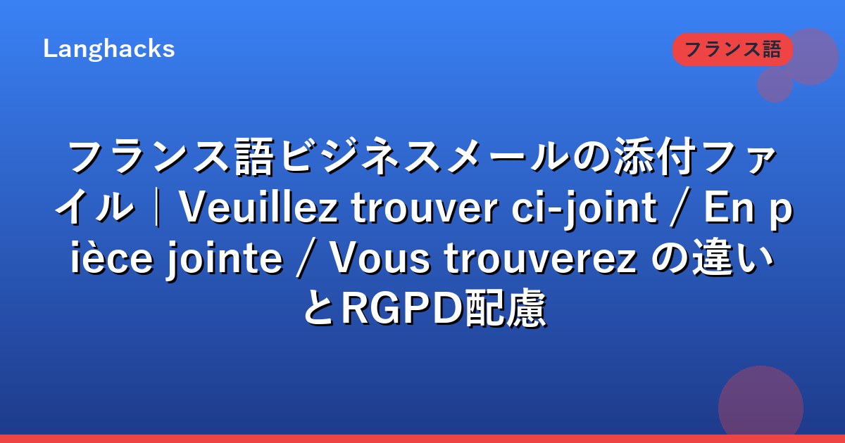 「Veuillez trouver ci-joint は古いか」「En pièce jointe との違い」「RGPD対応の暗号化」「WeTransferは仏で使えるか」といった悩みを整理します。
