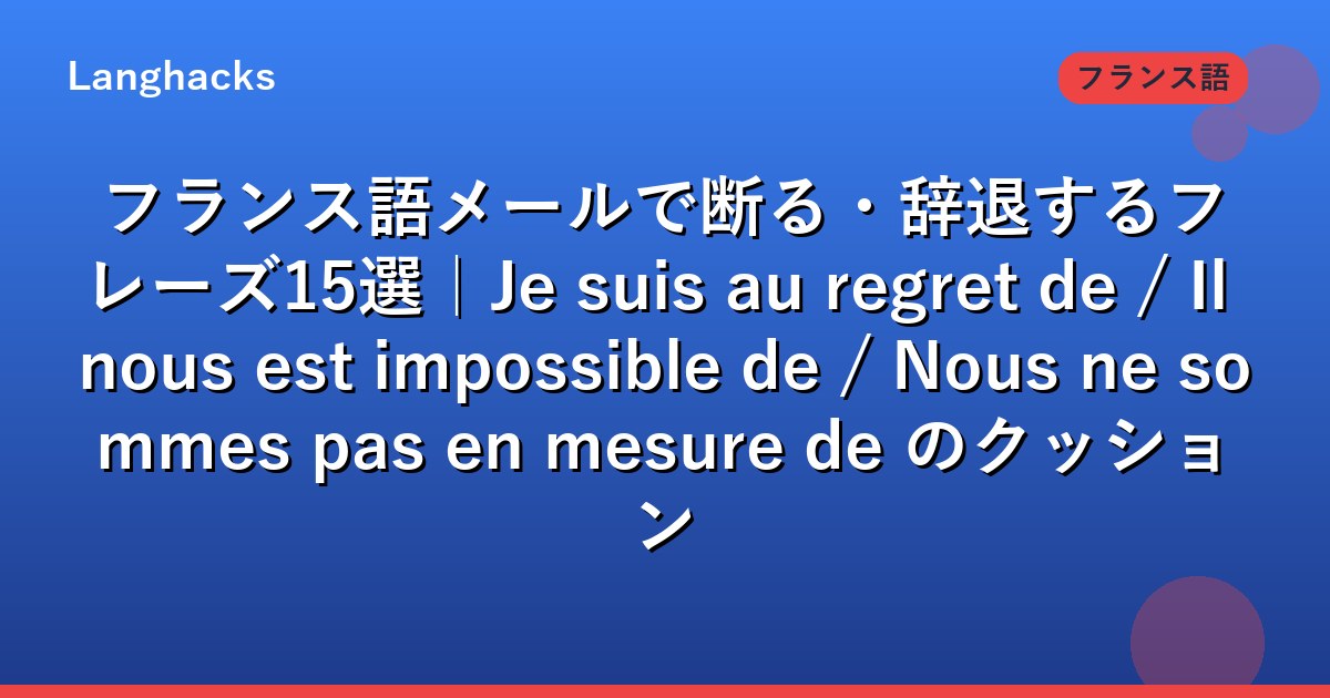 仏語断りは「クッション+Je suis au regret de/Il nous est impossible de/Nous ne sommes pas en mesure de+理由+代替」の4段で柔らかくできます。Nonを直接使わず、regret(残念)の表現で示すのが王道です。