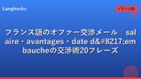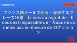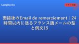 フランス語ビジネスメール全般の基本はフランス語ビジネスメール総合ガイド、フォーマル表現の一覧はフランス語フォーマル表現集、雑談との使い分けは仏オフィス雑談ガイドで補完できます。