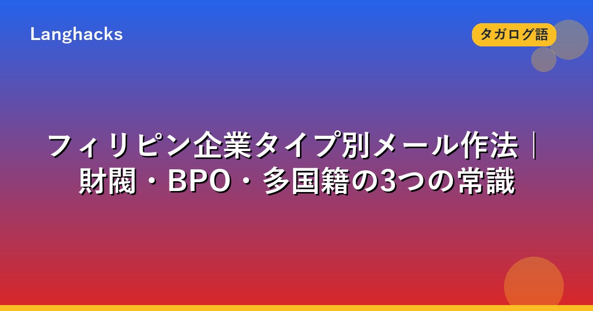 組織タイプ別の催促作法は、タガログ語ビジネスメールの催促10段階と組み合わせて学習してください。
